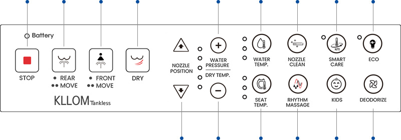 Press to activate drying mode. It stops working when you get up from the toilet seat or press "STOP" button. Drying with warm air will automatically stop in 3 minutes. Before using drying mode it’s better to use toilet tissue to wipe water. It will help to reduce drying time.